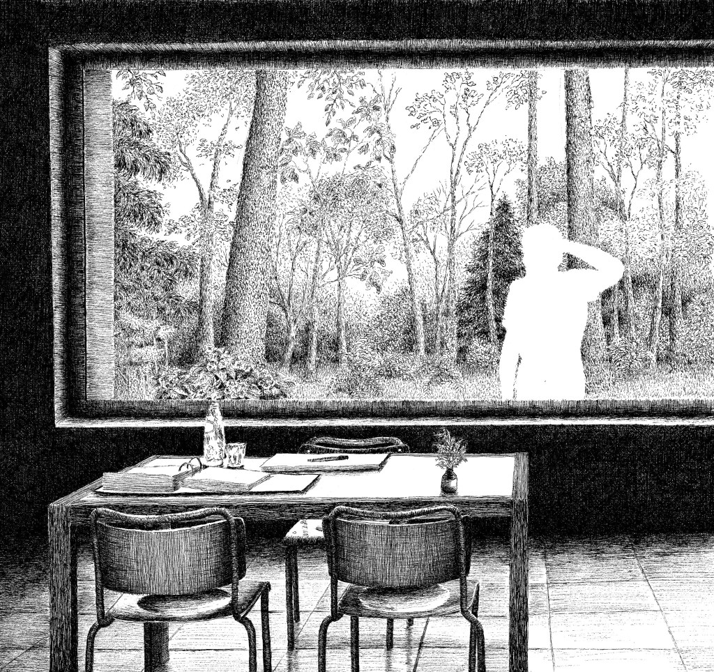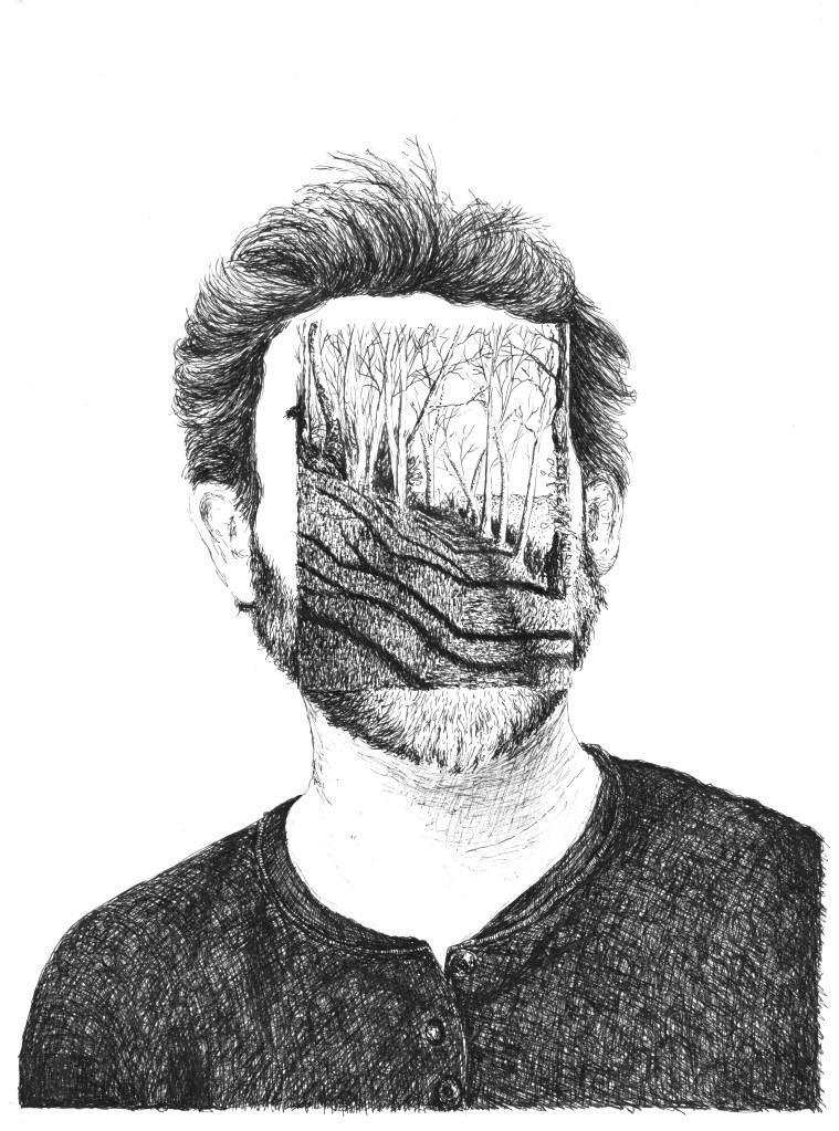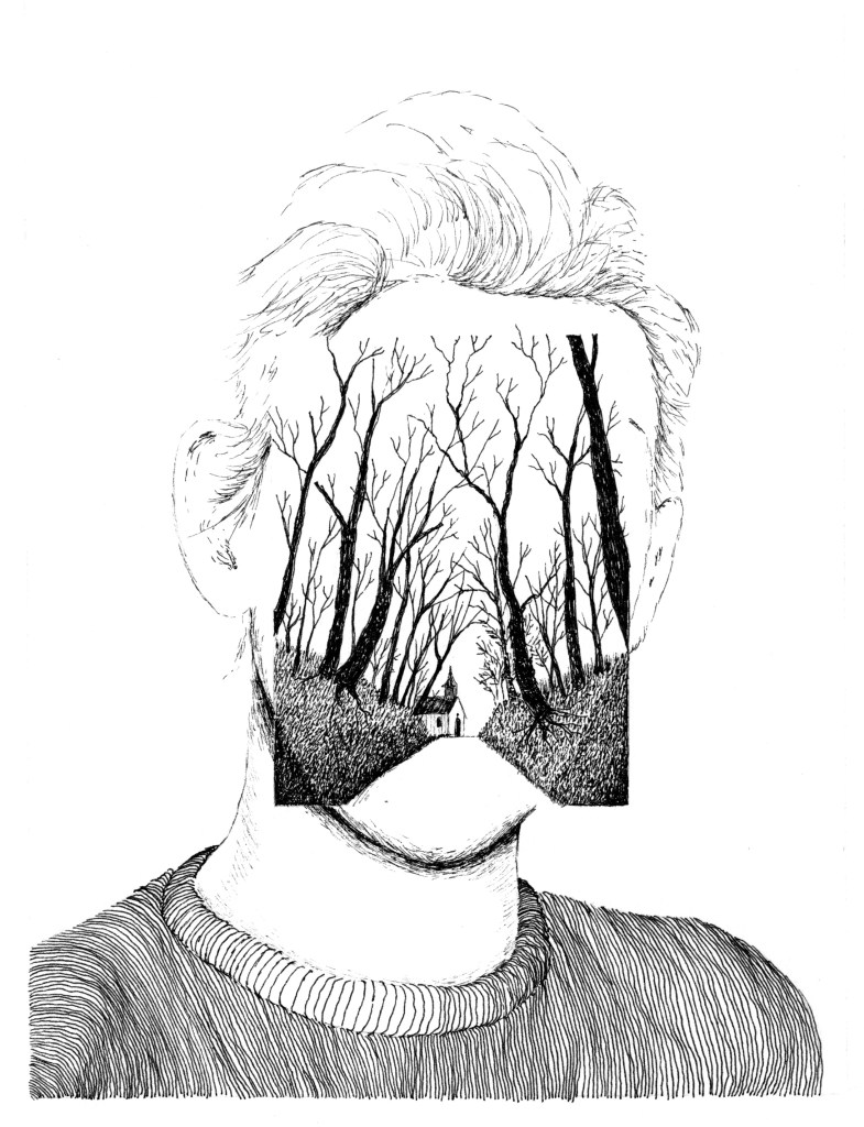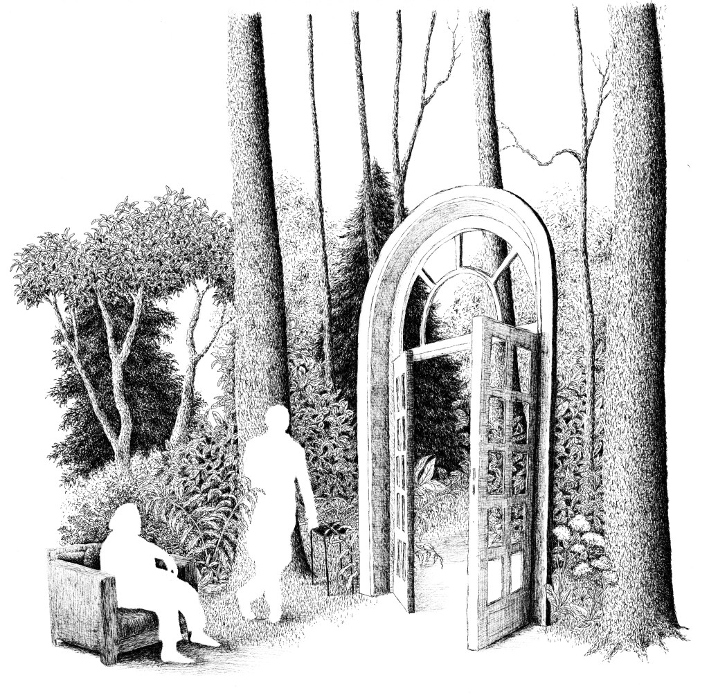 L’environnement naturel boisé est rendu de manière réaliste et détaillée. L’étrangeté provient de ces formes humaines blanches indéfinies qui contrastent grandement avec l’univers végétal finement ciselé qui les entoure.